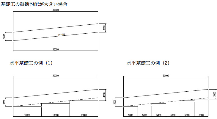 しかし、施工延長の長い道路擁壁などで基礎工の縦断勾配を大きい場合、基礎工の打設や積みブロックの施工が幾分困難になる場合があるなどから、ある程度の縦断勾配が基礎部である場合には、基礎をレベル(水平)にして施工します。